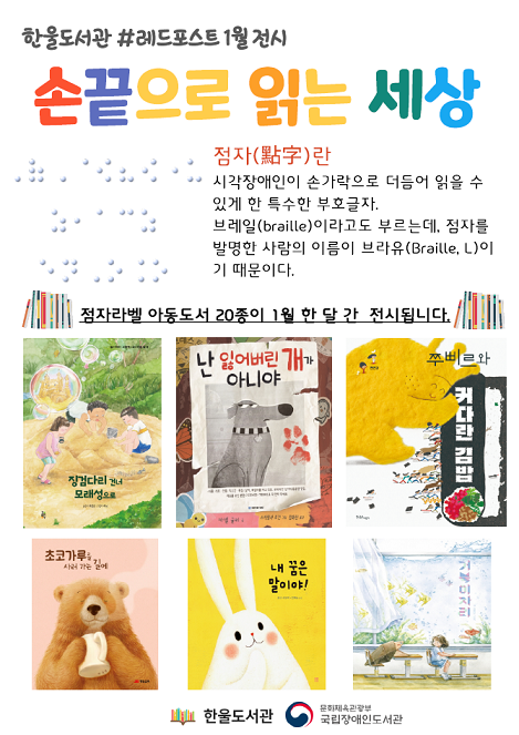 파주시 한울도서관은 1월 한 달간 한울도서관 로비에 위치한 서가 ‘#레드포스트’에 시각장애아동용 점자라벨도서 20종을 전시한다.이번 전시는 시각장애아동용 점자라벨도서 출판지원 및 장애인식개선 사업의 일환으로 국립장애인도서관에서 마련한 점자라벨도서 보급 사업으로 추진되며, 한울도서관과 함께 교하도서관, 탄현도서관도 대상기관으로 선정돼 점자라벨도서를 소장하게 됐다.