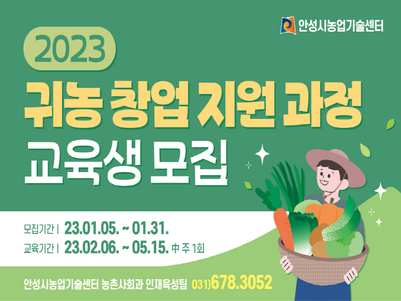안성시농업기술센터는 2023년 귀농창업지원과정 교육생을 오는 1월 5일부터 1월 31일까지 모집한다.