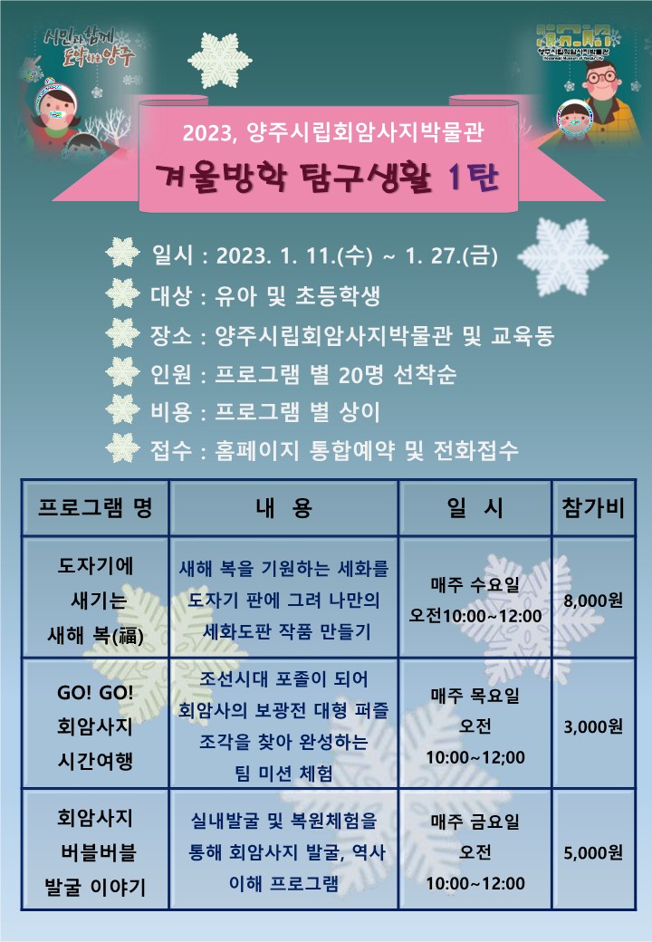 양주시립회암사지박물관은 오는 1월 11일부터 27일까지 유아(6~7세) 및 초등학생을 대상으로 겨울방학 특별프로그램 ‘겨울방학 탐구생활’ 1탄을 운영한다.
