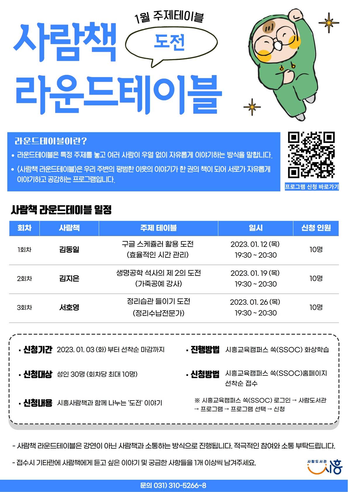 「1월 사람책 라운드테이블」에 참여하고 싶은 시민은 시흥교육캠퍼스 ‘쏙(SSOC)’ 누리집이나 사람도서관 누리집(https://vvd.bz/bVZS)을 통해 신청하면 된다.