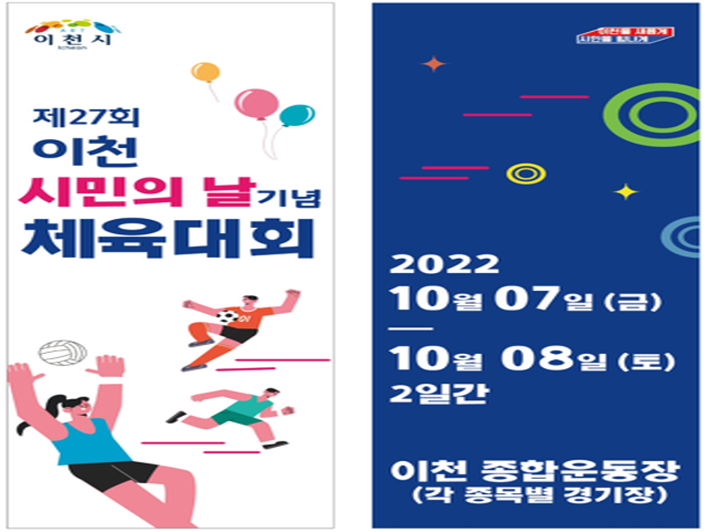이천시(시장 김경희)는 오는 10월 7일부터 8일까지 이천종합운동장에서 제27회 이천시민의 날을 맞이하여 읍면동 대항 체육대회를 개최한다.