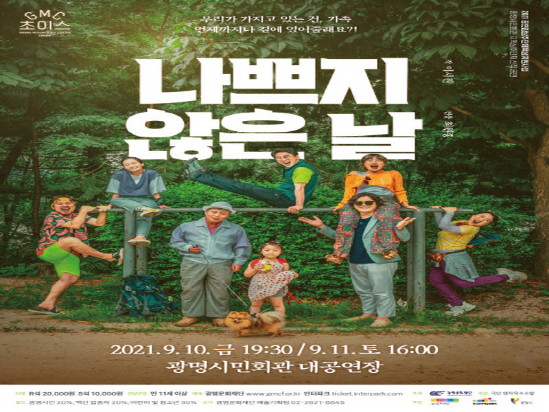 광명문화재단(대표이사 어연선)은 광명시민회관 기획 공연 극단 명작옥수수밭의 <나쁘지 않은 날>을 9월 10일(금) 오후 7시 30분, 9월 11일(토) 16시, 광명시민회관 대공연장에서개최한다.