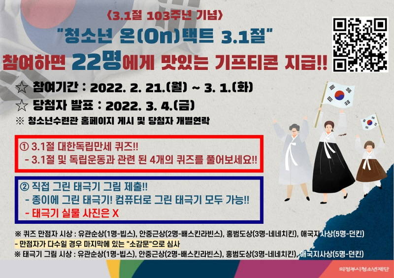 의정부시청소년재단(대표이사 이한범) 의정부시청소년수련관(관장 조경서)은 103주년 3.1절을 기념하여‘청소년 온택트 3.1절’행사를 오는 3월 1일까지 진행한다.