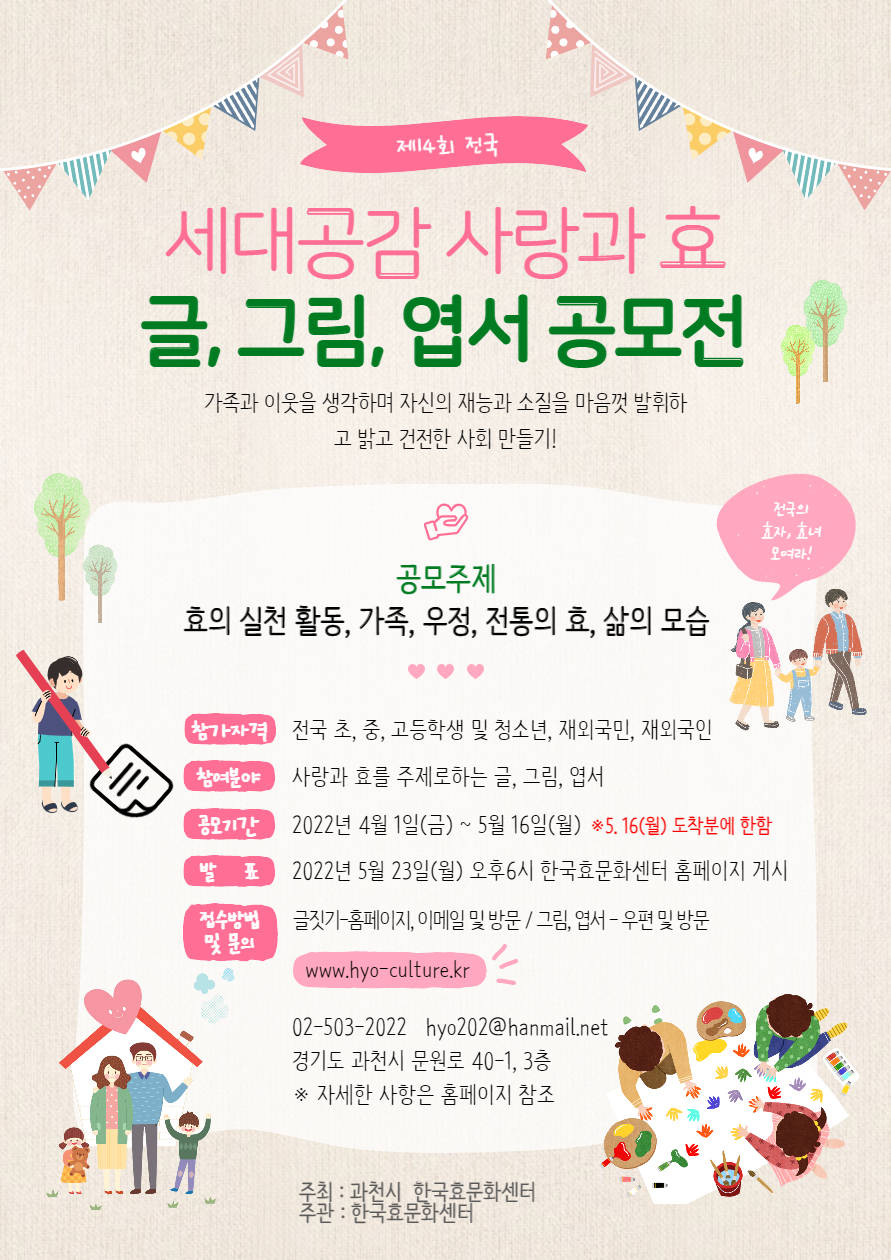 과천시와 한국효문화센터가 주최하고, 한국효문화센터가 주관하는 ‘제14회 전국 세대공감 사랑과 효 글, 그림, 엽서 공모전’이 1일부터 5월16일까지 개최된다.전국 초·중·고등학생 및 청소년, 재외국민, 재외국인을 대상으로 하는 이번 공모전은 ‘사랑과 효’를 주제로 효의 사회적 가치 확산을 통해 밝고 건전한 사회를 만들기 위해 마련됐다.