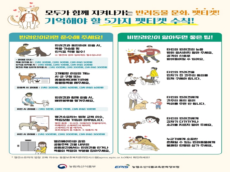 또, 2개월령 이상 반려견은 동물등록을 완료해야 하고, 비반려인의 안전을 위해 목줄 또는 가슴 줄을 착용해 반려견을 효과적으로 통제할 수 있어야 한다.