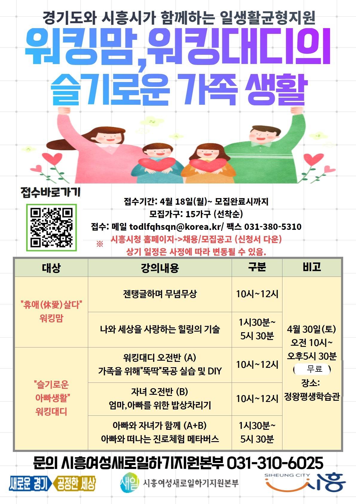 이번 ‘슬기로운 가족생활’ 프로그램은 4월 30일 오전 10시부터 시흥시 정왕평생학습관에서 진행되며 관내 초등학교 고학년 자녀를 둔 맞벌이 가정이 우선적으로 지원된다.