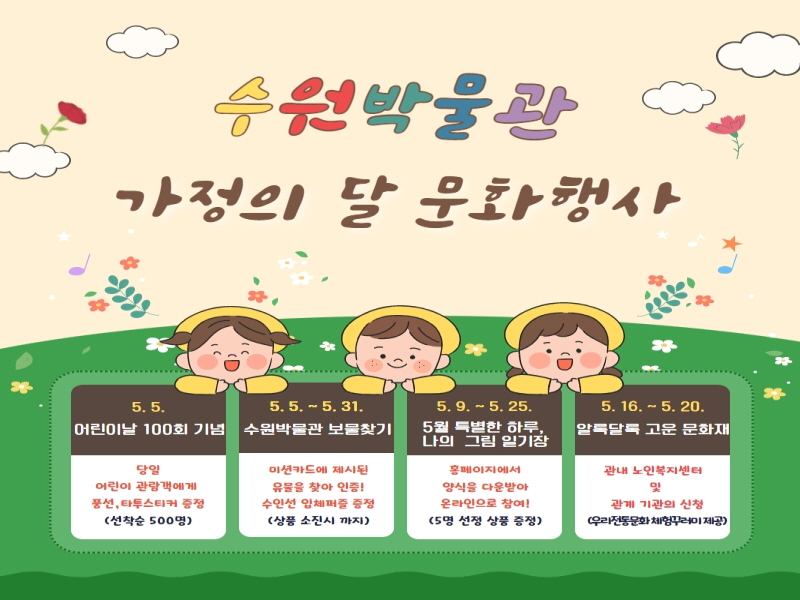 수원박물관이 제100회 어린이날과 가정의 달을 맞아 다채로운 문화행사를 마련했다.