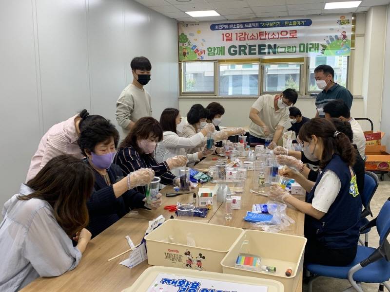 양주시 회천2동 행정복지센터(동장 홍미영)에서는‘재활용을 넘어 새활용으로’라는 탄소중립 이행 실천 확산을 위해 지난 4월 발족한 학습동아리인 ‘탄소다이어터’ 소속 회원들과 함께 양주시 자원봉사센터 직원들을 대상으로‘재활용 아이스팩 방향제 만들기 체험교육’활동을 전개했다.