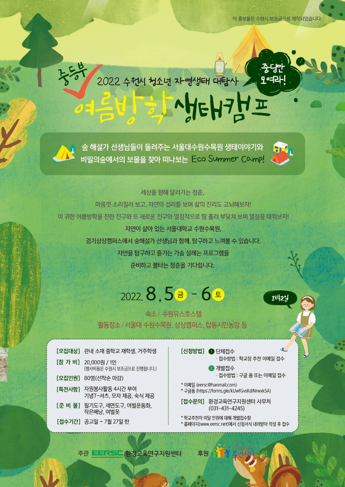 수원시가 여름방학을 맞아 ‘2022년 청소년 자연생태 대탐사’ 프로그램에 참여할 중학생 80명을 27일까지 선착순으로 모집한다.8월 5일부터 6일까지 1박 2일 일정으로 진행하는 ‘청소년 자연생태 대탐사’는 수원지역 청소년들의 생태 감수성을 키우고, 자연환경의 중요성을 알리는 프로그램이다.
