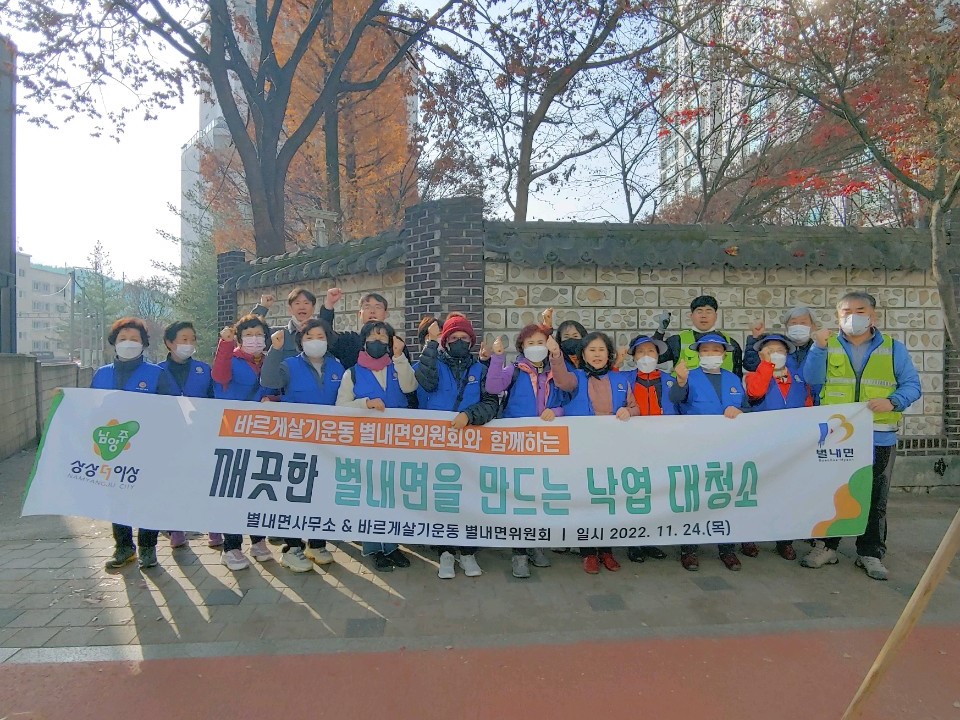 남양주시 별내면(면장 김현태)은 24일 깨끗한 별내면을 만들기 위해 청학리 일원의 가로수 낙엽을 수거했다고 밝혔다.