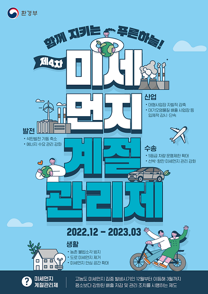 계절관리제는 평상시보다 강화된 미세먼지의 배출저감을 통해 시민의 건강을 보호하기 위한 조치로, 앞서 제3차 계절관리제 시행 결과, 초미세먼지 평균 농도 32㎍/㎥에서 28㎍/㎥으로 12.5% 개선되는 성과를 거뒀다.