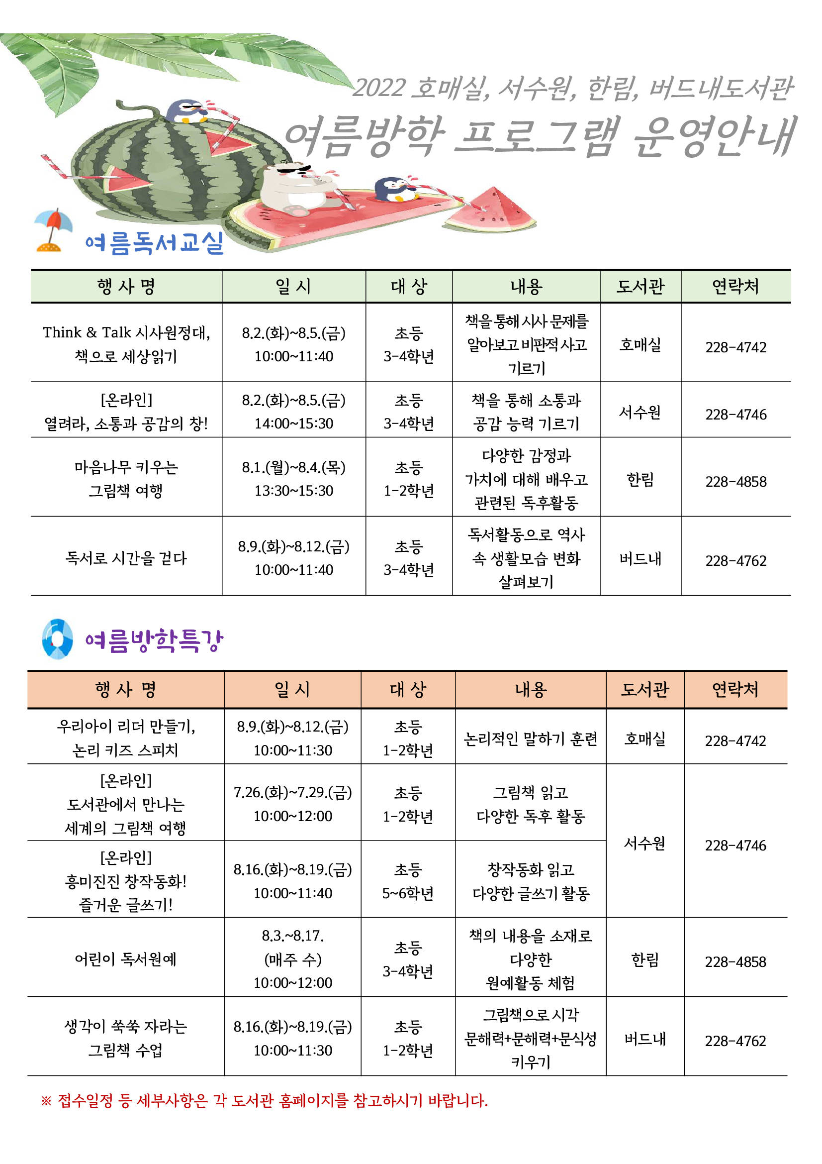 여름방학 특강은 아이들이 논리적으로 말하는 방법을 배우는 ‘우리아이 리더 만들기, 논리 키즈 스피치(호매실도서관, 8월 9~12일)’, 창작동화를 읽고 다양한 글쓰기 활동을 하는 ‘(온라인 교육) 흥미로운 창작동화! 즐거운 글쓰기!(서수원도서관, 8월 16~19일)’ 등이 운영된다.