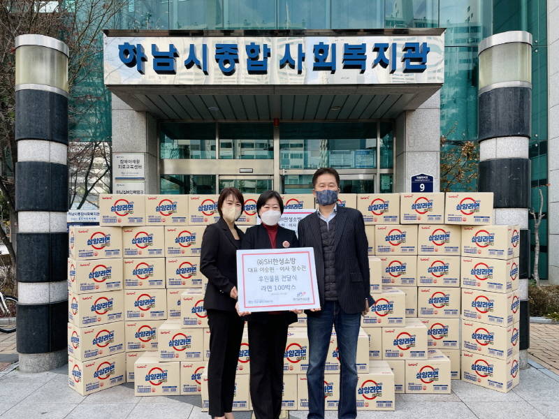 하남시 소재 ㈜SH한성소방 이승헌 대표와 장수진 이사는 하남시종합사회복지관을 방문하여 코로나19로 어려움을 겪는 취약계층 이웃을 위해 전달해 달라며 라면 100박스를 후원 하였다.