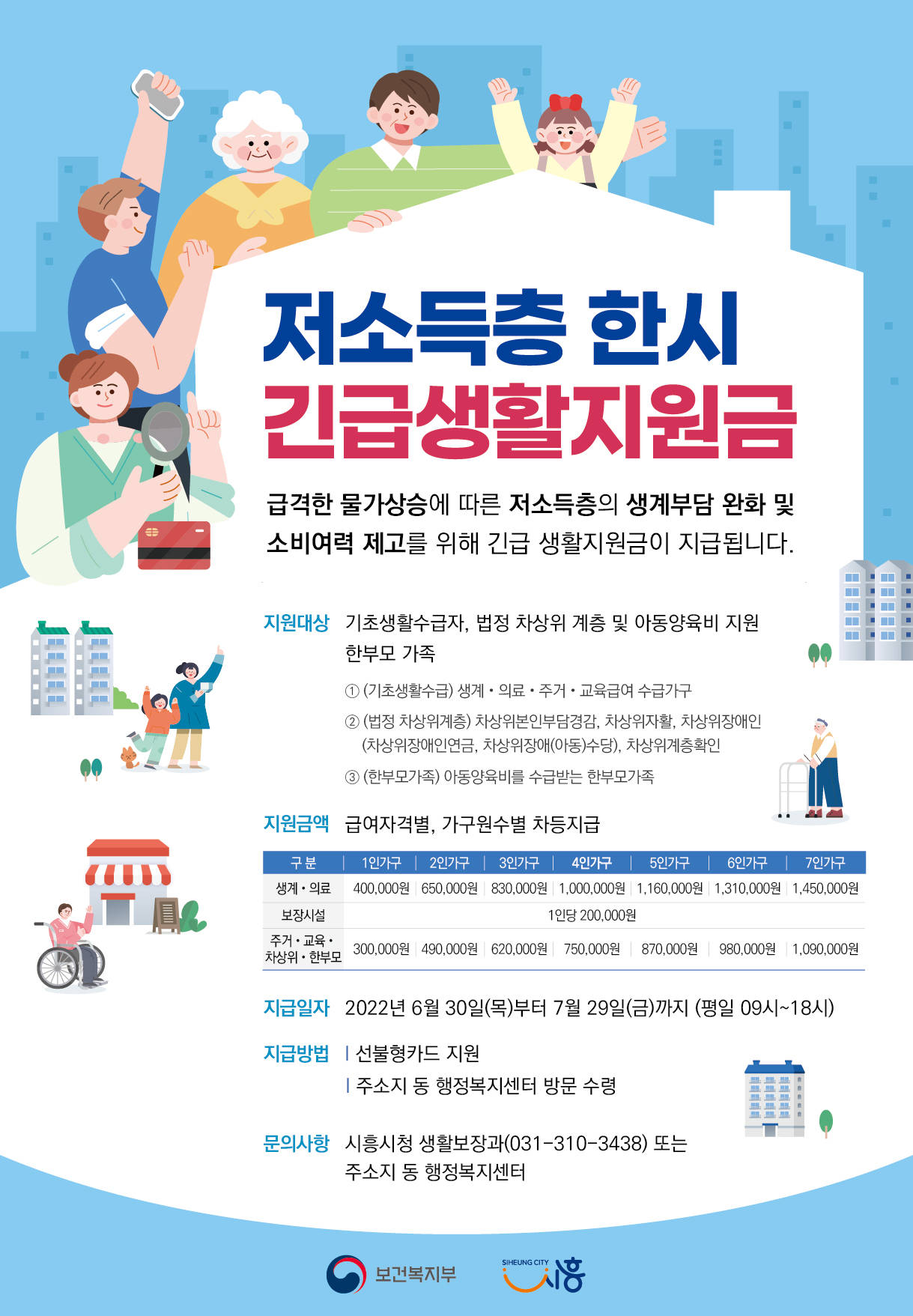 시흥시(시장 임병택)가 오는 6월 30일부터 코로나19 기간 중 급격한 물가 상승으로 어려움을 겪고 있는 저소득층의 생계 부담을 덜어주고자 한시 긴급 생활지원금을 지급한다. 이번 지원금은 정부의 2차 추가경정예산 편성에 따라 한시적으로 지원하며 전액 국비로 지급된다.지원 대상은 기초생활수급자(생계·의료·주거·교육급여), 차상위계층(차상위본인부담경감, 차상위장애인, 차상위계층확인) 및 아동 양육비를 수급하는 한부모 가족이 해당된다. 생계·의료 가구는 4인 기준 100만 원, 차상위 가구는 4인 기준 75만 원이며 급여 자격별, 가구 원수별로 차등 지급할 예정이다.