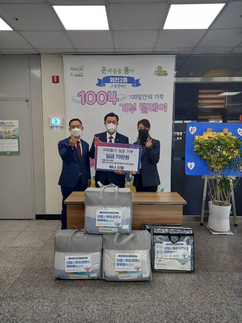 홍미영 회천2동장은 “어려운 경제상황에도 지역 내 소외된 이웃을 위해 기부에 참여해 주신 하나신협 김중열 이사장님과 임직원 여러분께 감사드린다”며 “나눠주신 소중한 온정은 관내 어려운 이웃을 위해 소중히 쓰겠다고 밝혔다