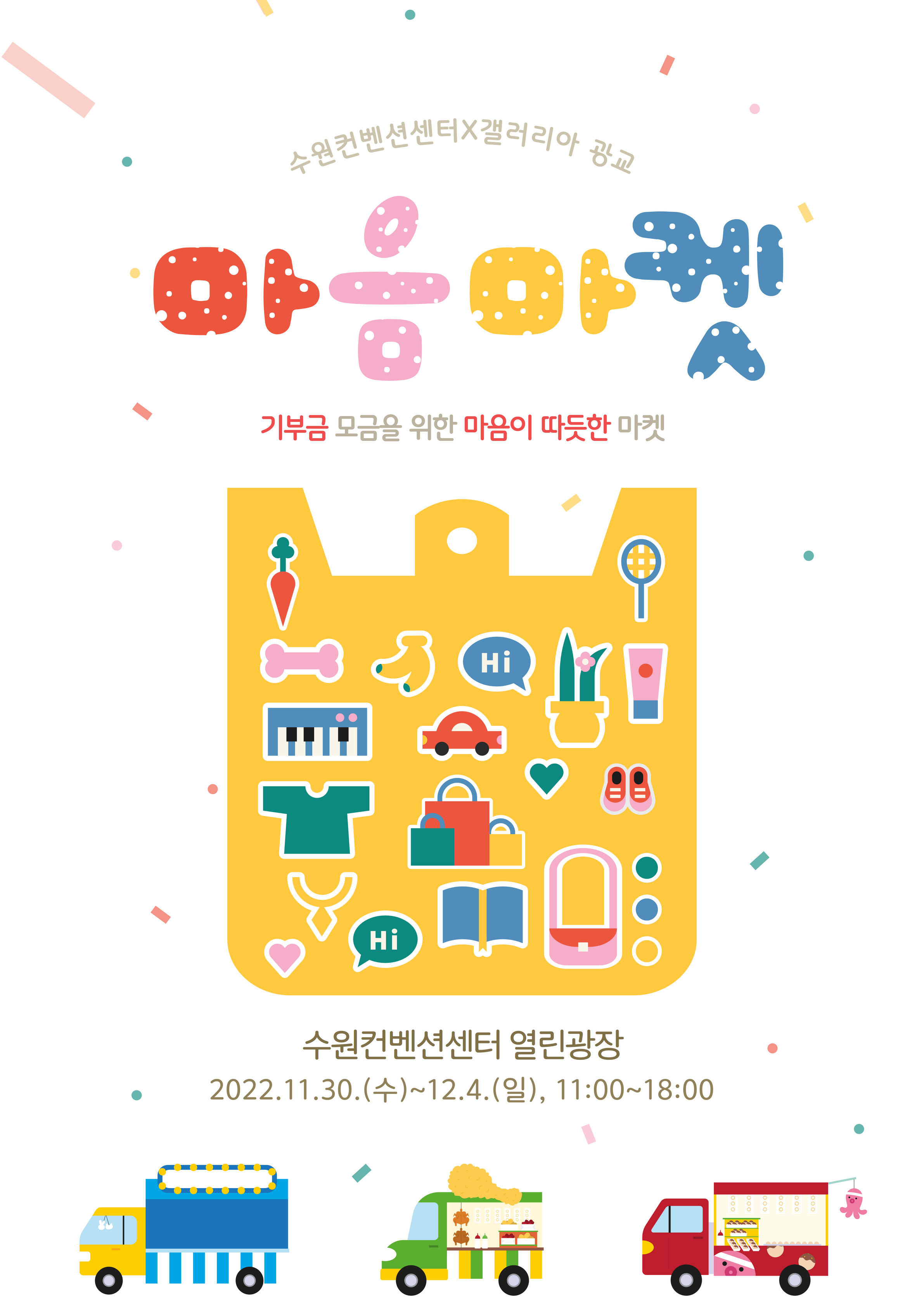 재단법인 수원컨벤션센터가 11월 30일부터 12월 4일까지 영통구 수원컨벤션센터 야외 열린광장에서 ‘마음마켓’ 행사를 연다.마음마켓은 연말을 맞아 수원지역 소외계층 등 어려운 이웃을 돕기 위한 성금을 모금하는 행사다.