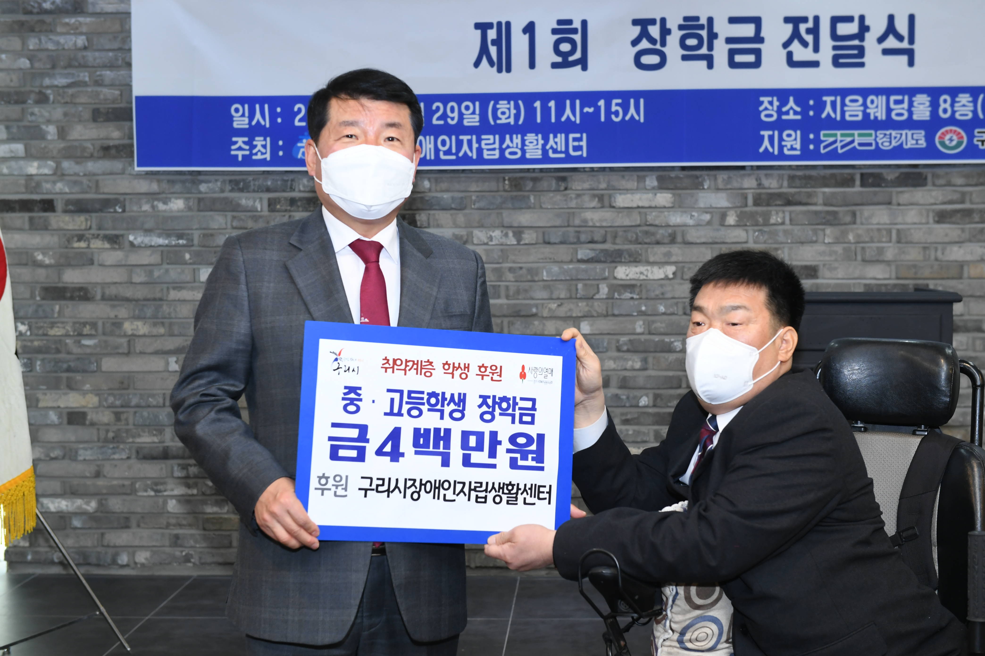 구리시(시장 백경현)는 지난 29일 인창동 지음웨딩홀 8층에서 장애인자립생활센터(센터장 이기수)로부터 저소득층 청소년들을 위한 장학금 4백만 원을 전달받았다.