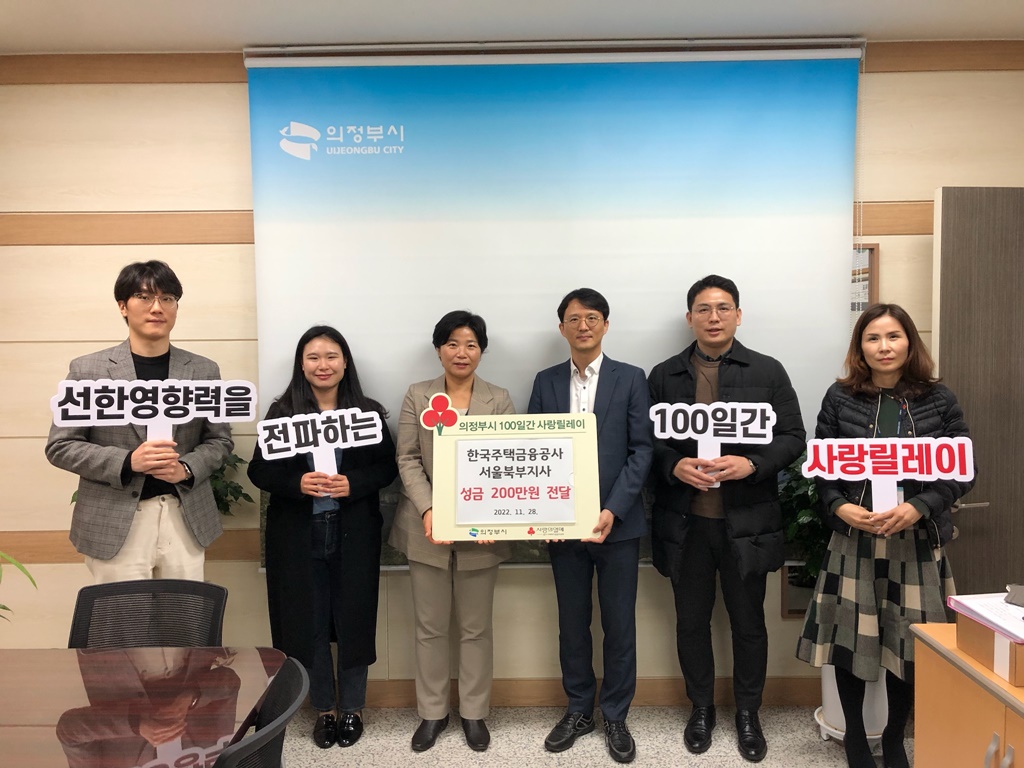 한국주택금융공사 서울북부지사는 2016년 10월 성금 기부를 시작으로, 매년 의정부시 100일간 사랑릴레이에 동참하고 있다.