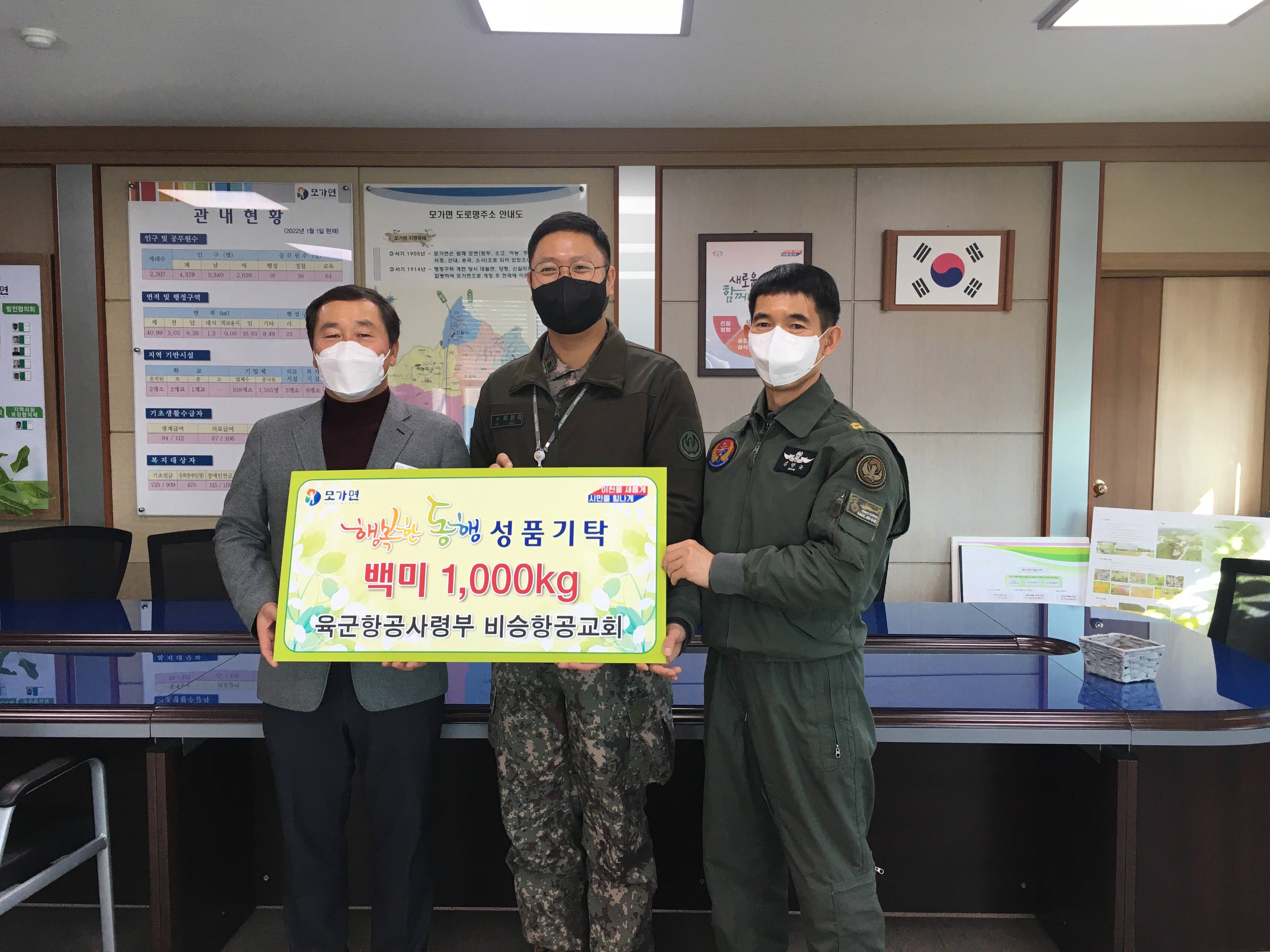 육군항공사령부 비승항공교회(목사 허원희)는 이달 1일 모가면행정복지센터에 방문해 취약계층 지원을 위한 백미 1,000kg(100포)를 기탁했다.