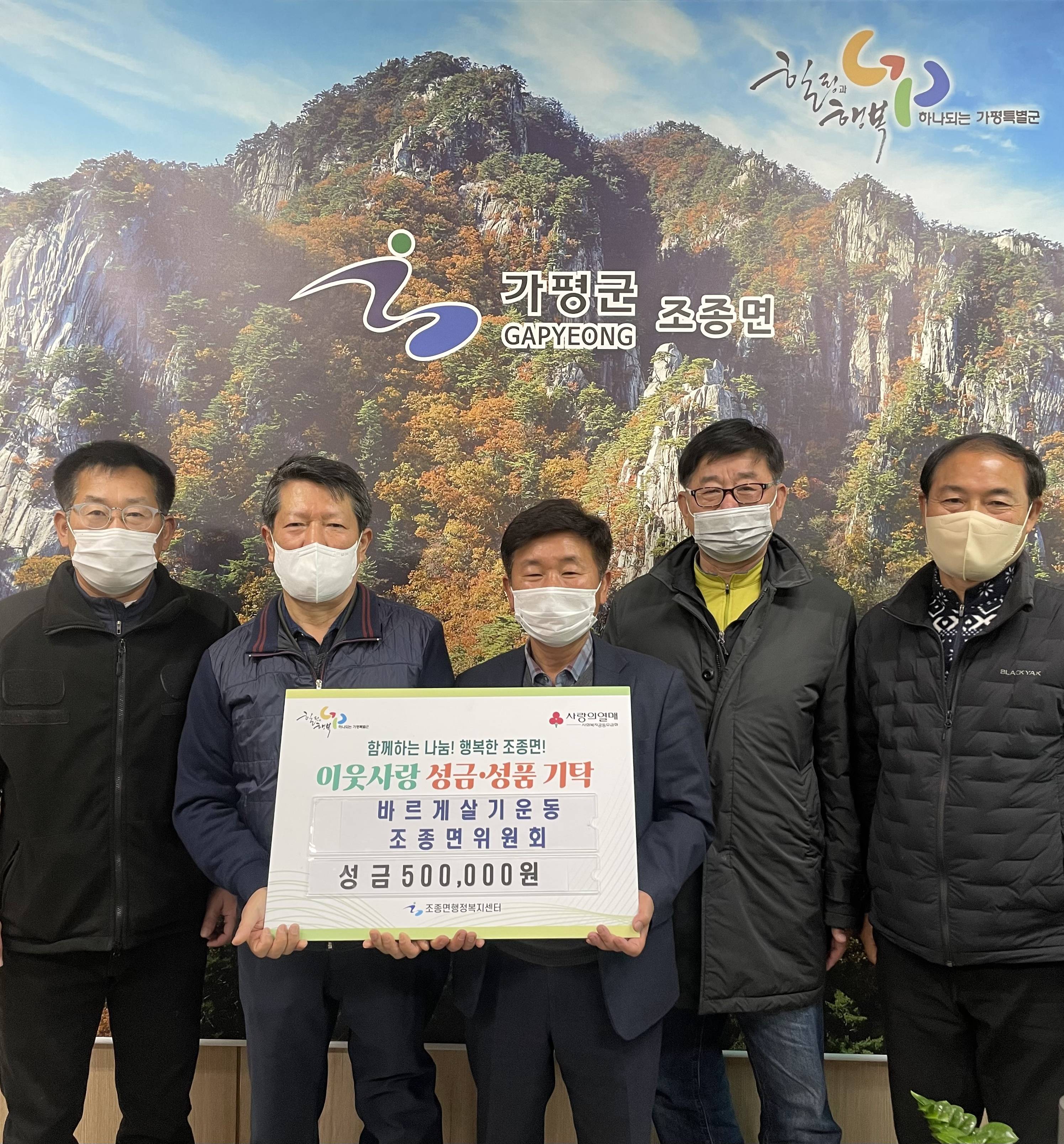 바르게살기운동 조종면 위원회(위원장 박전광) 회원 일동은 지난 1일 조종면행정복지센터를 방문하여 성금 50만원을 기탁했다.