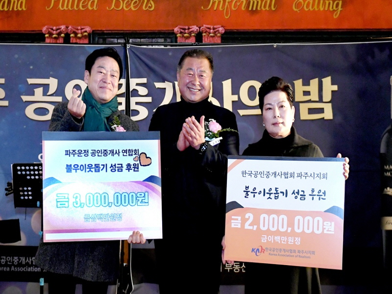 파주시(시장 김경일)는 지난 1일 한국공인중개사협회 파주시지회에서 이웃사랑 성금 500만원을 기탁받았다고 밝혔다.