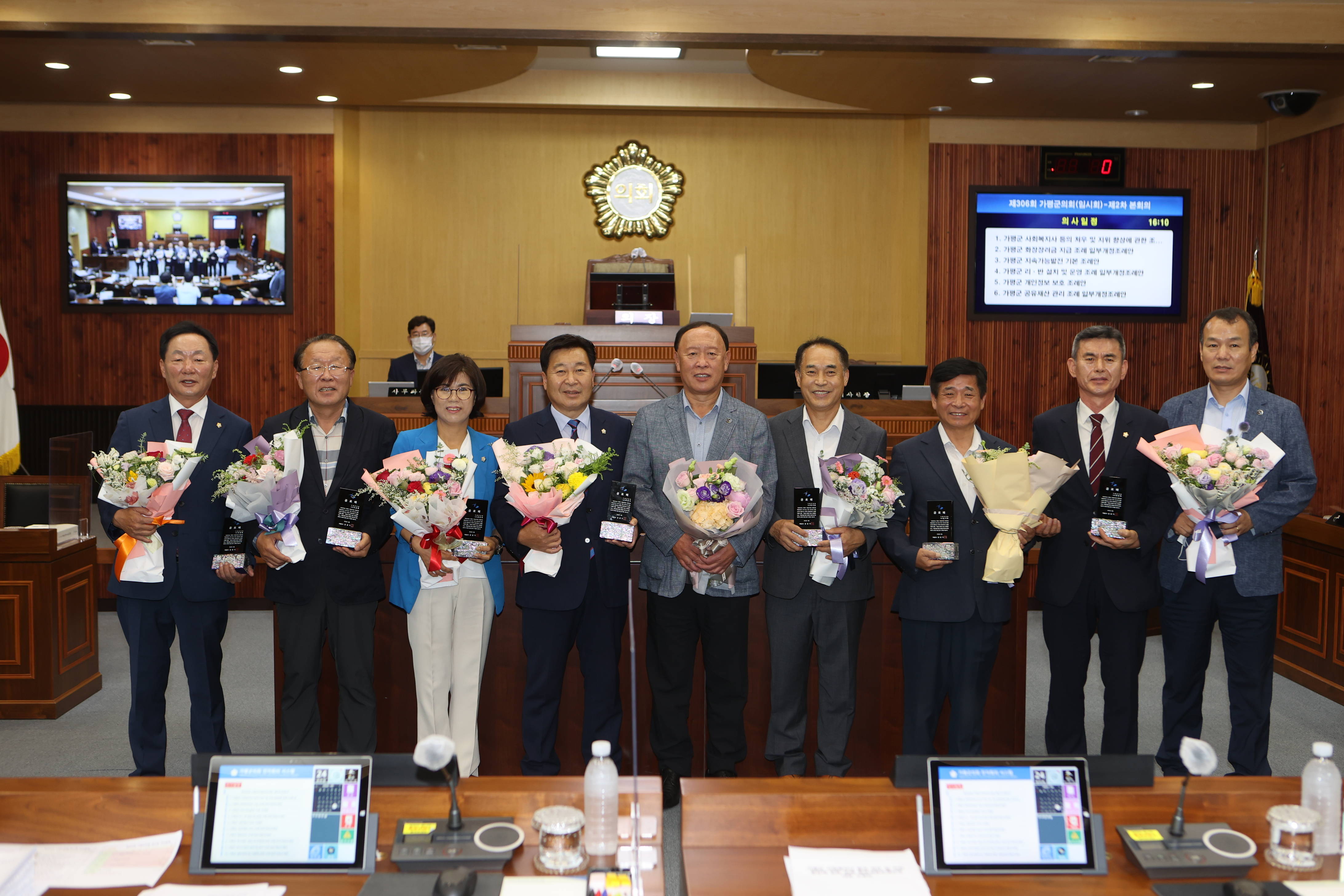 한편, 오늘 본회의 안건 상정에 앞서 8대 가평군의회가 공식적인 회기 일정이 이날 종료됨에 따라 제8대 가평군의회 모든 의원의 명의로김성기 가평군수에게 감사패를 전달하였고, 김성기 가평군수는 제8대 가평군의회 모든 의원들에게 공로패를 주었다.