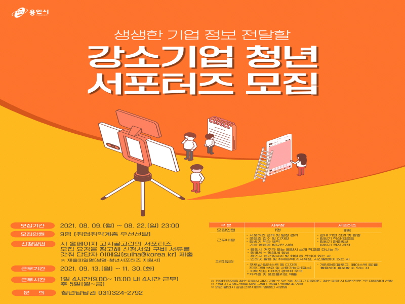 용인시는 9일부터 22일까지 지역 내 강소기업을 취재해 생생하게 전달할 ‘강소기업 청년 서포터즈’ 9명을 모집한다.