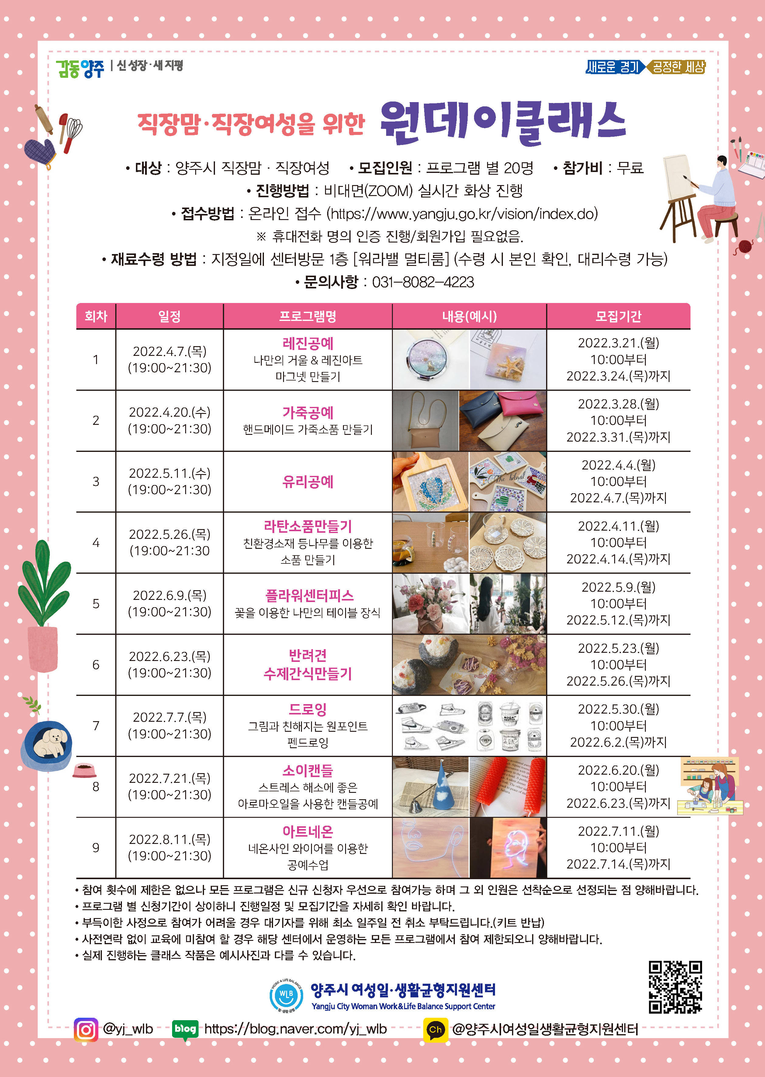양주시에 거주하는 직장맘‧직장여성이라면 누구나 무료로 참가 가능하며, 프로그램은 프로그램별 키트수령을 통한 비대면(ZOOM)으로 진행할 예정이다.
