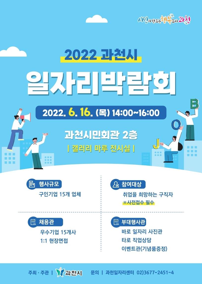 과천시는 코로나19 장기화로 얼어붙은 취업시장에 활기를 불어넣고, 취업난 극복을 위해 오는 16일 시민회관 2층 갤러리마루에서 오후 2시부터 ‘2022 과천시 일자리 박람회’를 개최한다.이번 박람회에는 관내 기업인 ㈜서울랜드, ㈜비버플랫폼, 케이텔레캅(주)와 관외 기업인 (사)한국산업경쟁력연구원을 포함 총 15개 기업이 참여해 채용담당자와 구직자간 1:1 현장 면접을 진행한다.