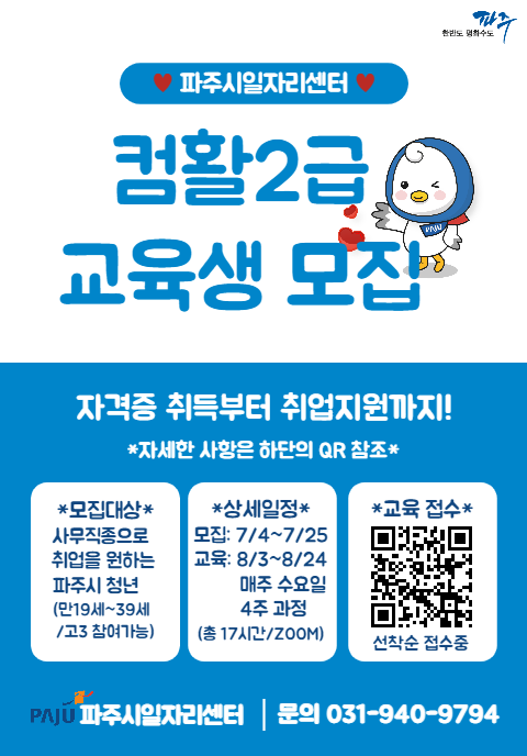파주시는 오는 25일까지 청년층을 대상으로 ‘컴퓨터활용능력 2급’ 자격증 참여자 20명을 모집한다고 밝혔다.‘컴퓨터활용능력 2급’ 자격증 프로그램은 청년들의 취업역량을 강화해 사무행정 분야로의 취업을 돕기 위해 마련했으며, 교육비는 무료다.