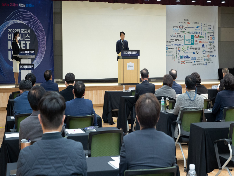 이번 비즈니스 밋업 사업은 관내 기업들의 산업 트랜드 방향에 맞는 신산업 오픈 이노베이션으로 기업들의 사업 협력을 통한 ‘기업의 성공 전략 특강’을 진행하고, 관내 6개 기업을 사전에 선정하여 ‘기업 IR 피칭’을 통한 기업발표 및 질의응답, 마지막으로 하은호 군포시장이 직접 참여하는 ‘기업인 현장 간담회’ 프로그램과 기업 간 네트워킹 시간으로 진행되었다.