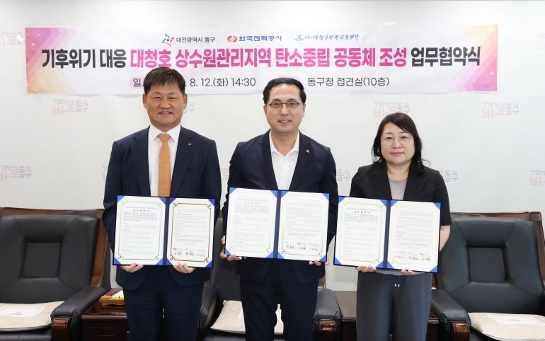 한방통신사 신태공 기자 | 대전 동구는 12일 구청장 접견실에서 한국전력공사 대전세종충남본부(본부장 신경휴)‧대청호보전운동본부(이사장 고창섭)와 ‘기후위기 대응 대청호 상수원관리지역 탄소중립 공동체 조성’을 위한 3자 업무협약을 체결했다고 밝혔다.