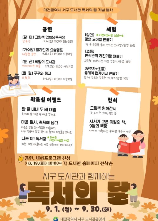 한방통신사 신태공 기자 | 대전 서구는 9월 독서의 달을 맞아 관내 5개 공공도서관(갈마·가수원·둔산·월평·어린이)에서 다채로운 행사를 한 달간 운영한다.