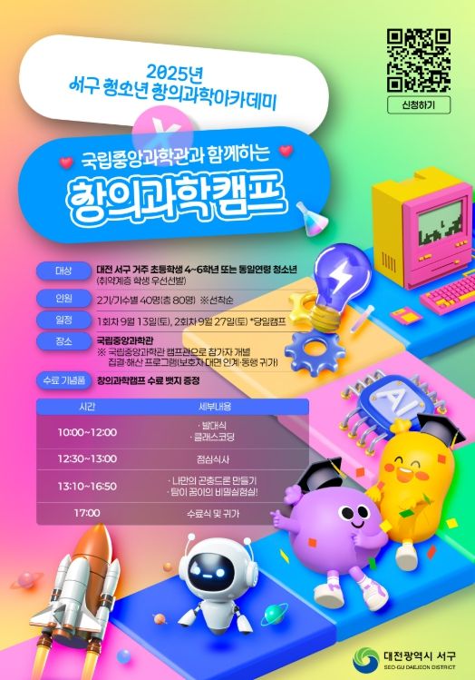 한방통신사 신태공 기자 | 대전 서구는 과학교육 격차 해소와 창의 인재 양성을 위해 지난 5월부터 운영한 ‘서구 청소년 창의과학아카데미’의 마지막 과정으로 ‘국립중앙과학관과 함께하는 창의 과학 캠프’ 2기 프로그램을 오는 9월 진행한다.