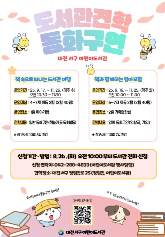 한방통신사 신태공 기자 | 대전 서구 어린이도서관은 오는 9월부터 관내 보육시설 및 유치원 아동을 대상으로 하반기 견학 연계 동화 구연 프로그램을 운영한다.