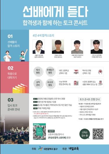 한방통신사 신태공 기자 | 대전 동구는 오는 23일 오전 10시 30분 동구청 대강당에서 중․고등학생과 학부모를 대상으로, 2026학년도 대학입시 설명회 ‘선배에게 듣다’를 개최한다고 19일 밝혔다.