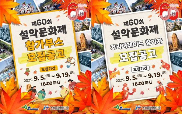 한방통신사 양호선기자 기자 | (재)속초문화관광재단은 오는 10월 24일부터 26일까지 3일간 속초 엑스포 잔디광장 및 설악로데오거리 일원에서 열리는 ‘제60회 설악문화제’의 성공적인 개최를 위해 지역문화 체험부스 및 거리퍼레이드 참가자를 모집한다.
