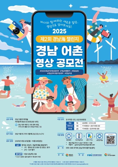 이상훈 경상남도 해양수산국장은 “평소 우리가 쉽게 접하기 어려운 어촌의 일상과 생생한 현장을 국민의 눈으로 담아내는 것이 이번 공모전의 취지”라며 “영상을 통해 어촌의 가치와 매력이 널리 알려지고, 더 많은 사람이 어촌을 방문하는 기회가 되길 바란다”고 밝혔다.
