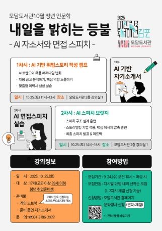 한방통신사 신유철기자 기자 | 김포시 모담도서관에서 생성형 인공지능을 활용해 자기소개서 및 면접 스피치를 준비해볼 수 있는 청년 대상 프로그램을 10월 25일 오전 11시부터 총 2차시에 걸쳐 운영한다.