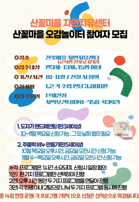한방통신사 신태공 기자 | 금산군보건소는 어린이를 대상으로 한 체험 프로그램 산꽃마을 오감놀이터를 10월부터 11월까지 산꽃마을 자연치유센터(군북면 산꽃로 672)에서 운영한다.