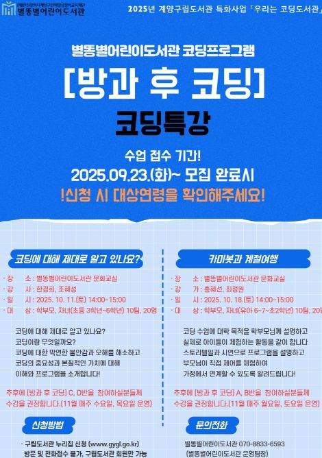 한방통신사 신유철기자 기자 | 인천 계양구립별똥별어린이도서관은 2025년부터 실시된 초·중등학교 코딩교육 의무화에 따라 지역 아동들의 디지털 역량 강화를 위해 10월부터 코딩 특화사업 ‘방과 후 코딩’을 운영한다고 밝혔다.
