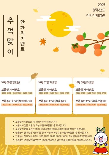 청주랜드 관계자는 “추석을 맞아 어린이들이 가족과 함께 우리 전통문화를 직접 체험하며 즐거운 명절의 추억을 쌓을 수 있도록 다양한 프로그램을 준비했다”며 “많은 시민들의 관심과 참여를 바란다”고 전했다.