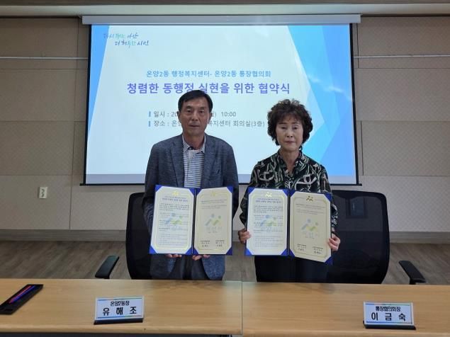 유해조 온양2동장은 “이번 청렴 협약은 온양2동과 통장협의회가 함께 청렴 실천의 본보기가 되겠다는 약속”이라며 “앞으로도 지역의 든든한 파트너로서 투명하고 공정한 행정을 실현해 나가겠다”고 밝혔다.