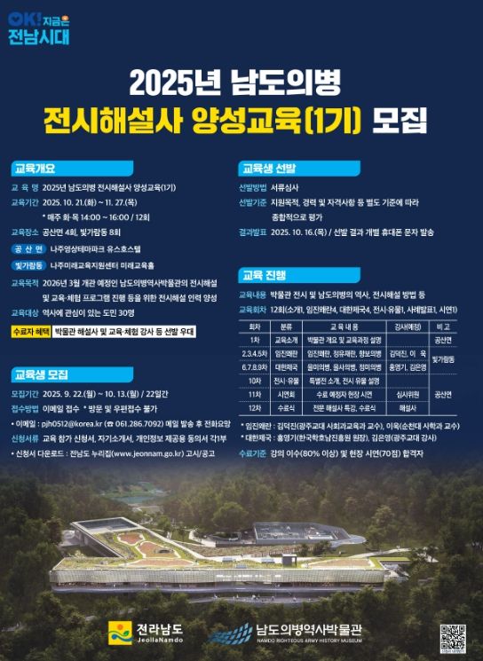 한방통신사 신다은기자 기자 | 전라남도는 2026년 3월 개관 예정인 남도의병역사박물관에서 활동할 전시해설사와 교육·체험 강사 양성을 위해 오는 10월 13일까지 교육생 30명을 모집한다고 밝혔다.