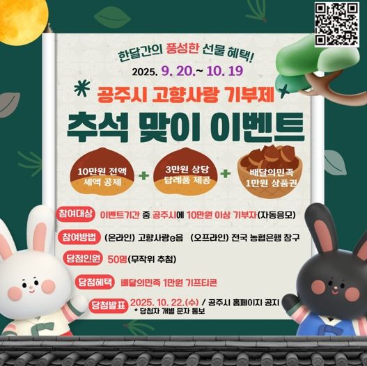 이번 이벤트는 30일 동안 진행되며, 오는 10월 19일까지 인터넷 ‘고향사랑e음’ 누리집 또는 전국 농협은행 창구에서 공주시에 10만 원 이상 기부하면 자동으로 응모된다.