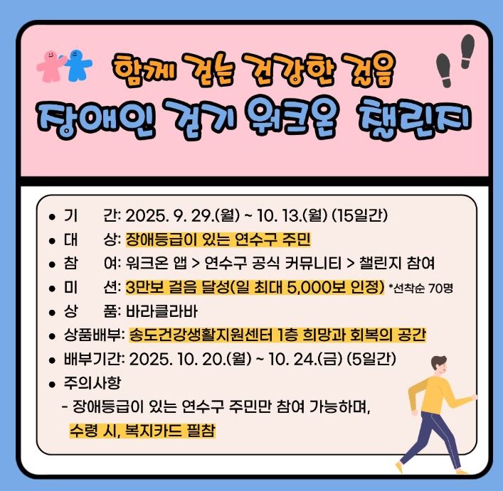 한방통신사 신유철기자 기자 | 연수구가 지역 장애인의 건강 증진과 자가 건강관리 능력 강화를 위해 ‘함께 걷는 건강한 걸음, 장애인 걷기 워크온 챌린지’를 운영한다.