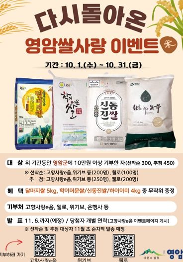이영주 영암군 홍보전략실장은 “이번 이벤트를 통해 기부자분들께 영암 대표 쌀을 선물로 드리고, 동시에 지역 농가에도 활력을 불어 넣겠다”고 밝혔다.