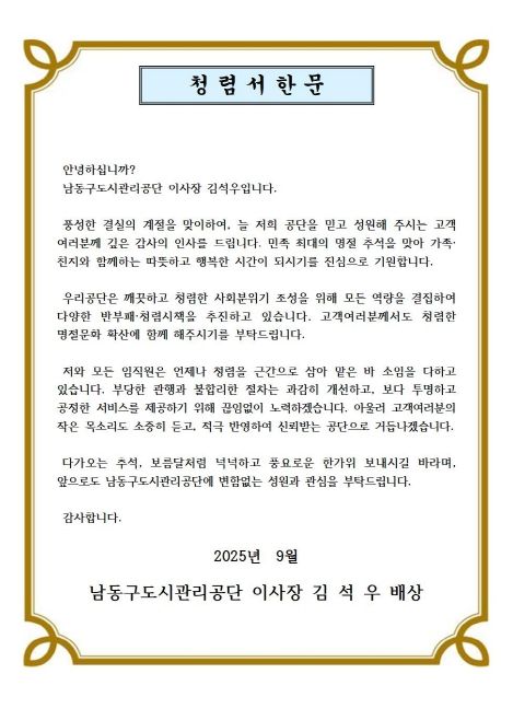 한방통신사 신유철기자 기자 | 인천시 남동구 도시관리공단은 청렴 문화 정착을 위해 공사, 용역, 물품 관련 업체와 전 직원에게 ‘청렴 서한문’을 발송했다고 29일 전했다.