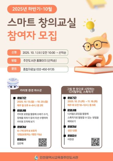 한방통신사 신유철기자 기자 | 인천광역시교육청주안도서관은 10월 1일 오전 10시부터 ‘10월 스마트창의교실’ 참여자를 모집한다.
