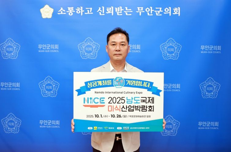 한방통신사 신다은기자 기자 | 무안군의회 이호성 의장은 김산 무안군수와 박종대 영암군의회 의장의 지명을 받아 오는 10월 1일부터 26일까지 목포문화예술회관 일원에서 열리는 ‘2025 남도국제미식산업박람회’ 성공을 기원하는 릴레이 응원 캠페인에 동참했다.